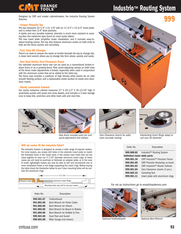 Industrio routing system with a new phenol insert integral aluminium scales and improved fence. CMT Cabinet for Industrio Detail. 01032006 A good router table is flat and has a stout base and a fence able to support jigs and hold-downs.